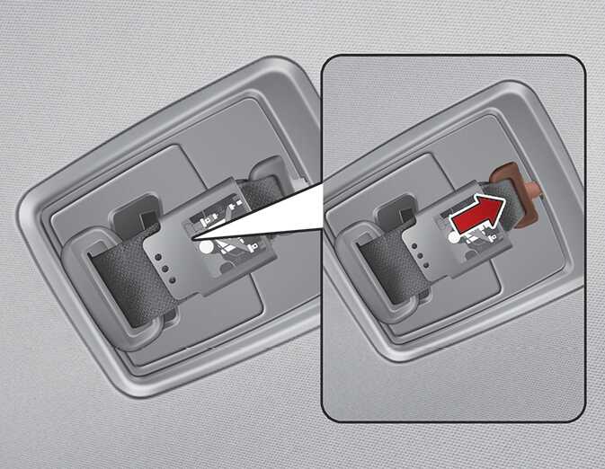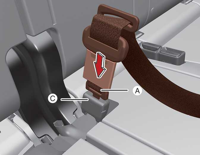 To retract the rear center seatbelt, insert the tongue plate or similar small rigid device into the web release hole (C). Pull up on the seat belt web (A) and allow the webbing to retract automatically.