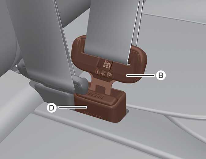 Pull the tongue plate (B) and insert the tongue plate (B) into the open end of the buckle (D) until an audible “click” is heard, indicating the latch is locked. Make sure the belt is not twisted.