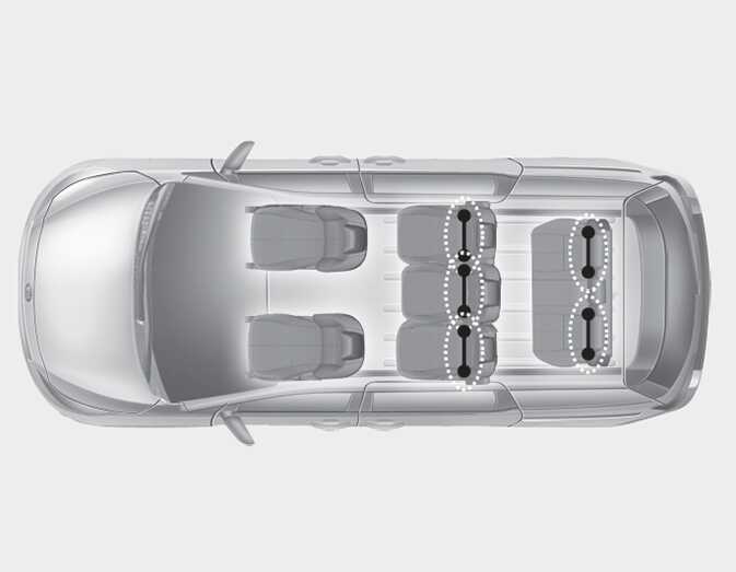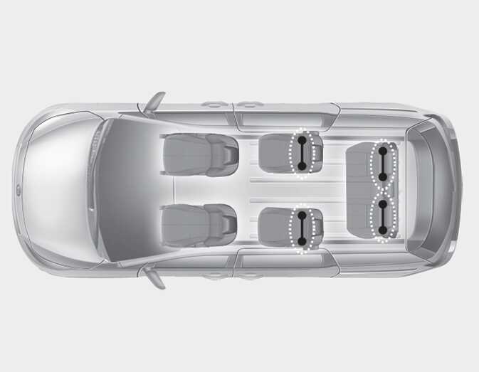 For the 7 passenger vehicle, LATCH anchors have been provided in the left and right outboard rear seating positions. For the 8 passenger vehicle, a second row center seat LATCH anchor is also provided. Their locations are shown in the illustrations. There are no LATCH anchors provided for the 3rd row center seating position.