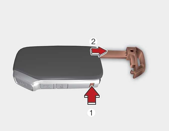 To remove the mechanical key, press and hold the release button (1) and remove the mechanical key (2).