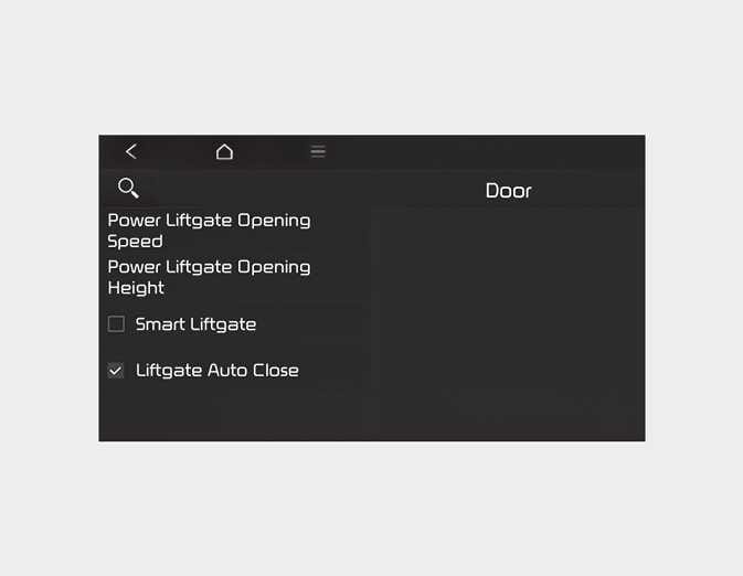 With the vehicle on, select 'User Settings → Door/Liftgate → Power liftgate Auto Close' to turn on Power liftgate Auto Close and deselect to turn off the feature in the instrument cluster or select 'Setup → Vehicle Settings → Door/Liftgate → Power liftgate Auto Close' to turn on Power liftgate Auto Close and deselect to turn off the feature in the infotainment system.