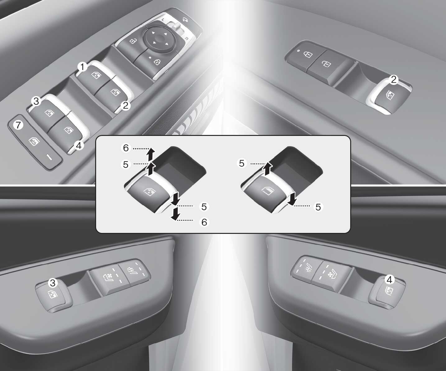 Each door has a power window switch that controls the door's window. The driver has a power window lock button which can block the operation of rear passenger windows. The power windows can be operated for approximately 3 minutes after ignition switch or ENGINE START/STOP button turned to the ACC or LOCK position. However, if the front doors are opened, the power windows cannot be operated even within the 3 minutes period.