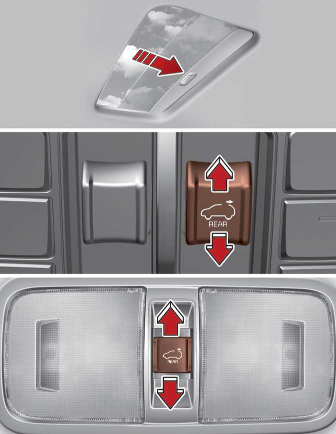 Rear seat sunroof: The sunroof glass stops halfway (first detent position) before it is fully opened. To fully open the sunroof glass, push the sunroof switch rearward once more. At this time, the sunroof glass opens only while the switch is pushed.