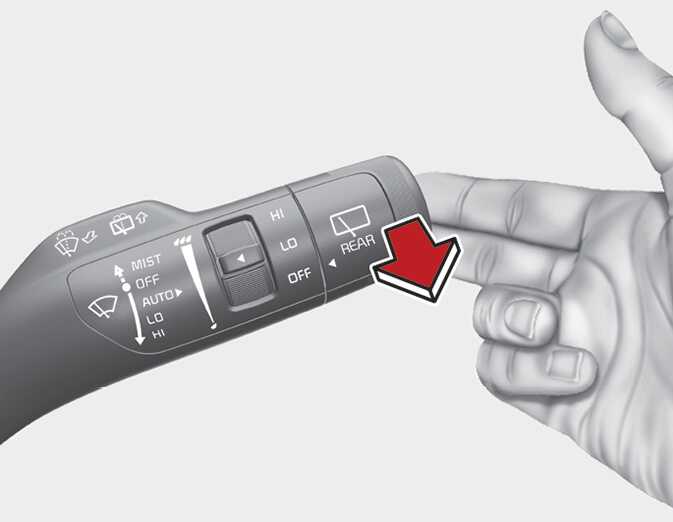 Pull the lever gently toward you to spray washer fluid on the windshield and to run the wipers 1 ~ 3 cycles. Use this function when the windshield is dirty. The spray and wiper operation will continue until you release the lever.