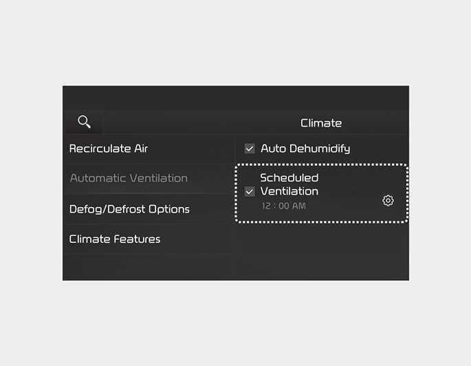To use the Scheduled ventilation function, select 'Climate → Automatic Ventilation → Scheduled Ventilation Control' on the infotainment system screen.The vehicle will be automatically ventilated at the selected time and date.