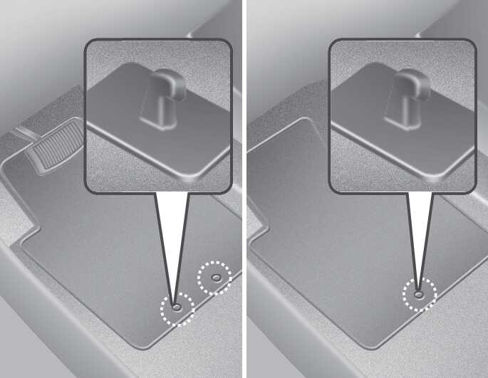 Use floor mats not too thick and designed to be properly secured on the floor to avoid the interference with pedals. Make sure that installing the floor mats without removing plastic films on carpets may damage or break floor mat fix rings, resulting in the mats to be unsecured.
