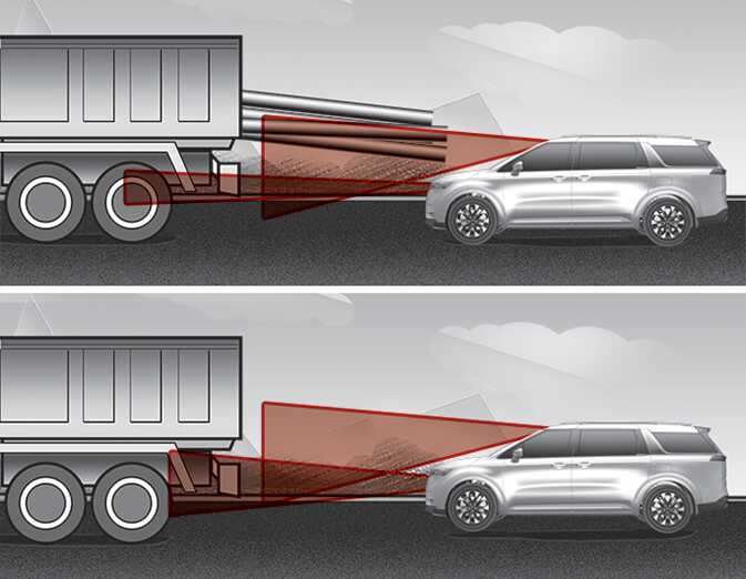 OKA4050023NIf the vehicle in front of you has cargo that extends rearward from the cab, or when the vehicle in front of you has higher ground clearance, additional special attention is required. Forward Collision-Avoidance Assist may not be able to detect the cargo extending from the vehicle. In these instances, you must maintain a safe braking distance from the rearmost object, and if necessary, steer your vehicle and depress the brake pedal to reduce your driving speed in order to maintain distance.