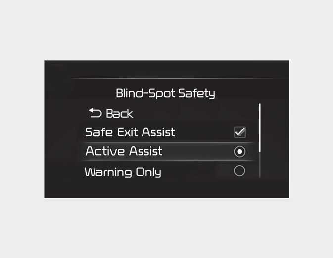 With the engine on, select or deselect 'Driver Assistance → Blind-Spot Safety' from the Settings menu to set whether or not to use each function.