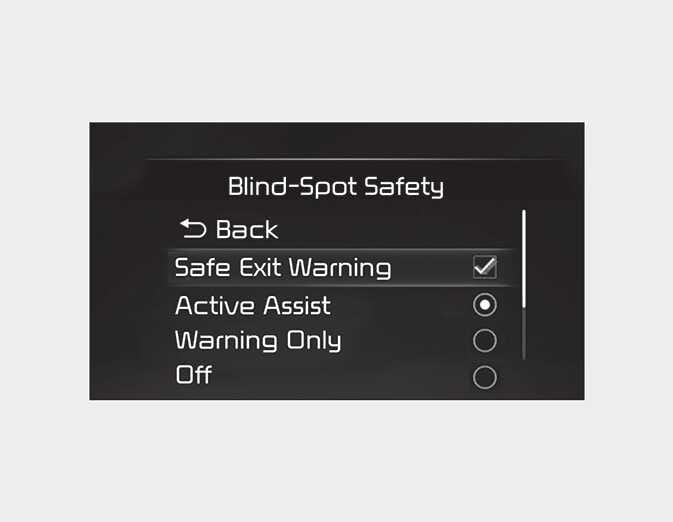 With the engine on, select 'Driver Assistance → Blind-Spot Safety → Safe Exit Warning (SEW) (or SEW (Safe Exit Warning)' from the Settings menu to turn on Safe Exit Warning and deselect to turn off the function.