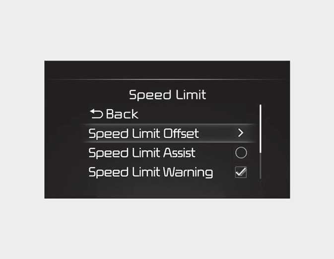 Speed Limit Warning function warns the driver when driving speed exceeds the speed at which the set Offset is added to speed limit. If you want Speed Limit Warning to warn you immediately when the driving speed exceeds the speed limit, set the offset to '0'.