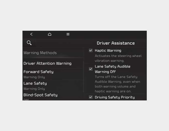 If not equipped with the navigation system, select 'User Settings → Driver Assistance' to adjust the Warning Volume.