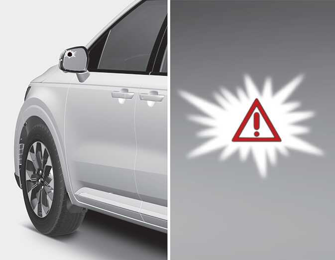 To warn the driver of an approaching vehicle from the rear left/right side of your vehicle, the warning light on the outside rearview mirror will blink and a warning will appear on the cluster. At the same time, an audible warning will sound. If the Rear View Monitor is operating, a warning will also appear on the infotainment system screen.