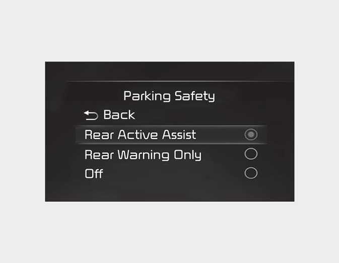 If 'Rear Active Assist' is selected, the function will be in the ready status. The function will warn the driver and assist with braking when a collision with a pedestrian or an object is imminent.