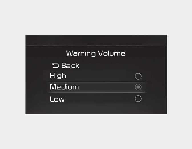 • Warning Volume : Select 'User Settings → Driver Assistance → Warning Volume' on the LCD display or 'Settings → Vehicle → Driver Assistance → Warning Methods → Warning volume' on the Infotainment system.