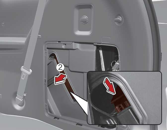 Push the upper hook of the rear air filter cover and open the cover (2).