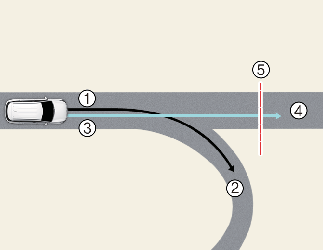감속 시작 시점은 차량의 주행속도와 도로의 곡률에 따라 다릅니다. 주행속도가 높을수록 감속 시작 시점이 빨라집니다.