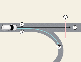 감속 시작 시점은 차량의 주행속도와 진출입로의 곡률에 따라 달라집니다. 주행속도가 높을수록 감속 시작 시점이 빨라집니다.