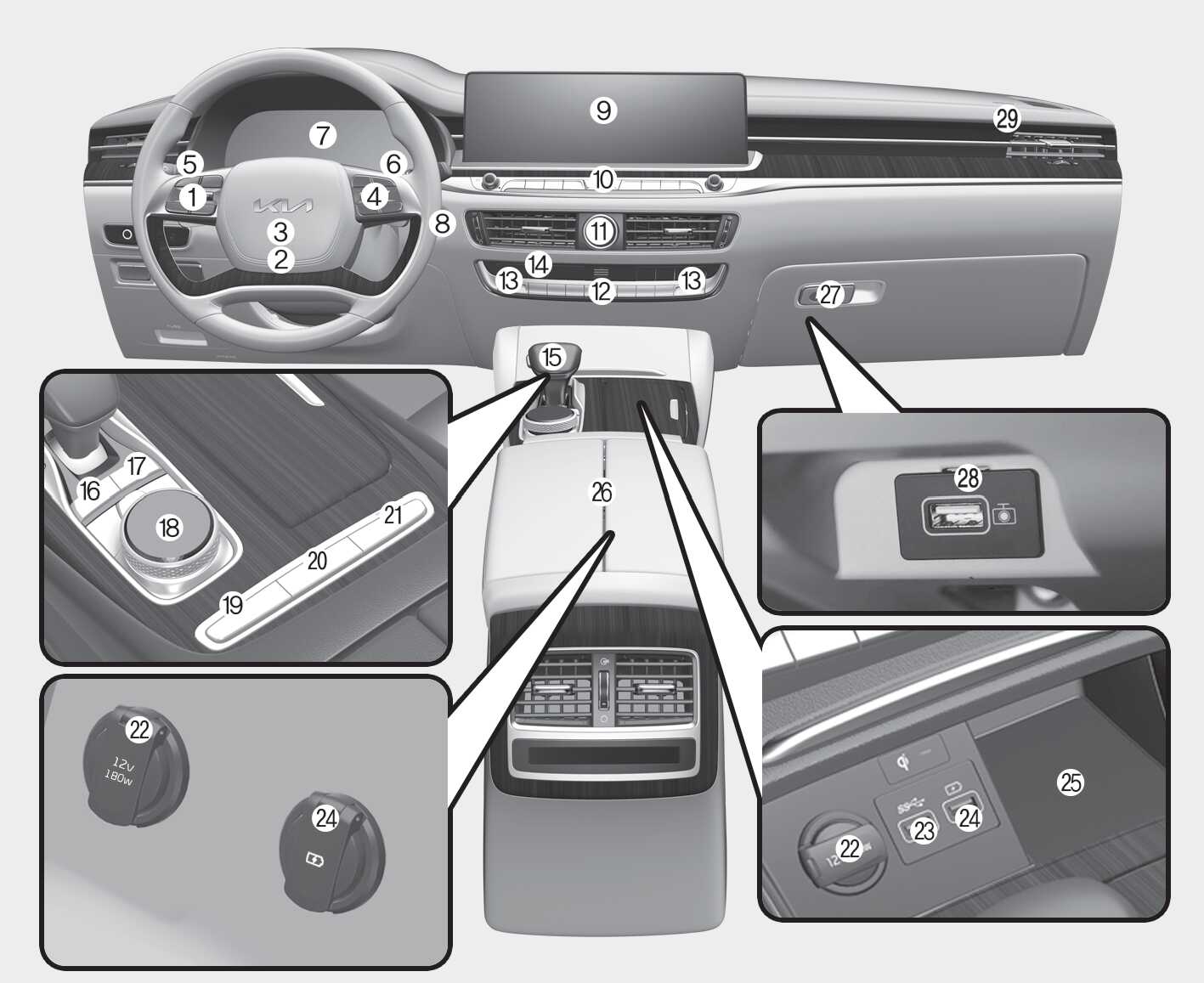 본 도안은 실제 차량과 다를 수 있습니다. (스위치의 모양 및 배열은 사양 적용에 따라 달라질 수 있습니다.)