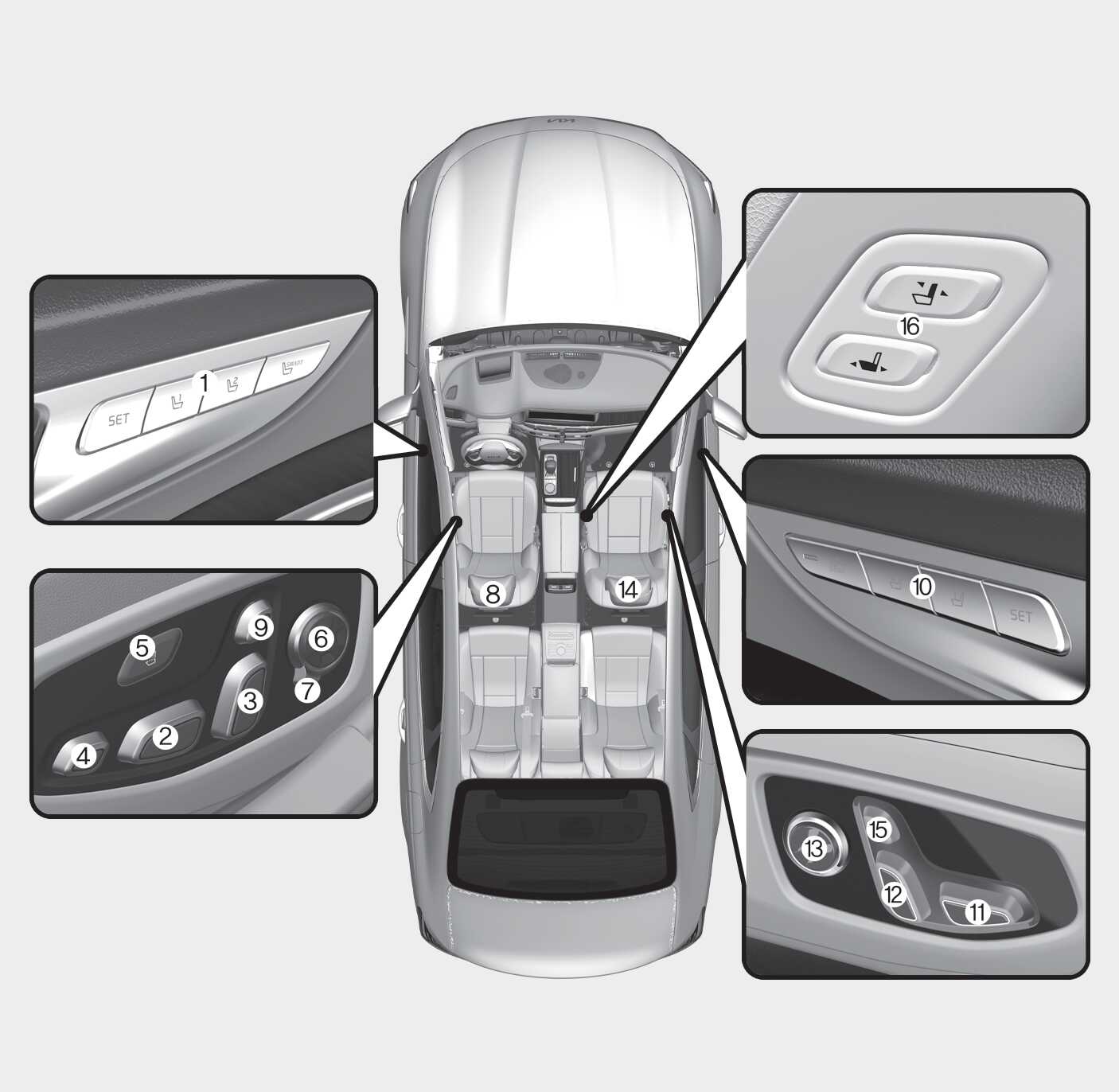 좌석의 전·후, 각도, 높낮이 등을 조절하여 올바른 운전 자세가 되도록 하십시오.