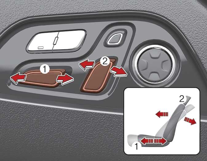 조절 스위치 (1),(2) 스위치가 연동해서 작동하며 등받이 각도 조절과 전·후 위치가 동시에 이루어집니다.