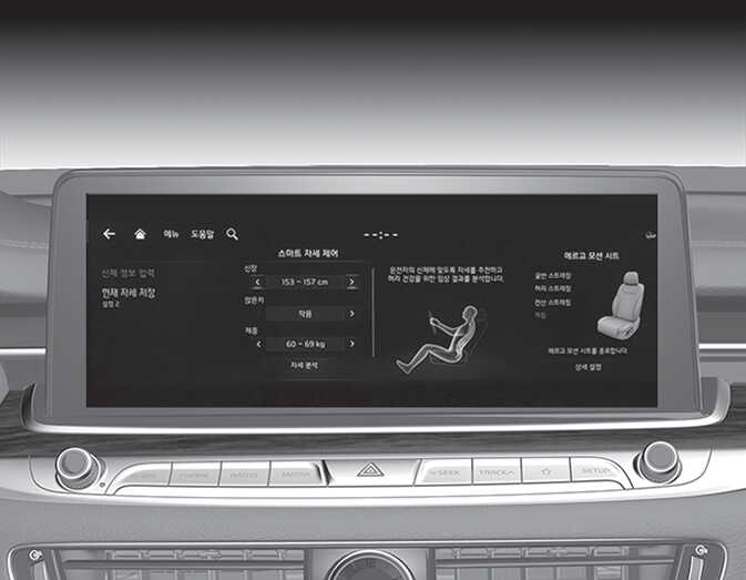 운전석 스마트 운전자세 메모리 시스템은 인포테인먼트 시스템을 통해 입력된 운전자의 신체 사이즈에 따라, 운전과 가장 적합한 올바른 승차 자세를 자동으로 설정 해주는 장치입니다.