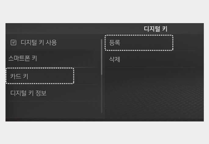 인포테인먼트 전체 메뉴 화면에서 '설정→차량→디지털 키→카드 키'하위 메뉴로 이동하여 '등록'을 누르십시오.