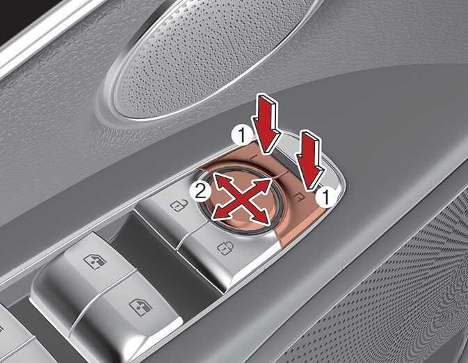 미러 조절 시 미러 조절 스위치 “▶”(2) 부분을 정확히 누르십시오. 이외 부분을 누를 시 원하지 않는 방향으로 조절 되거나 오작동이 될 수 있습니다.