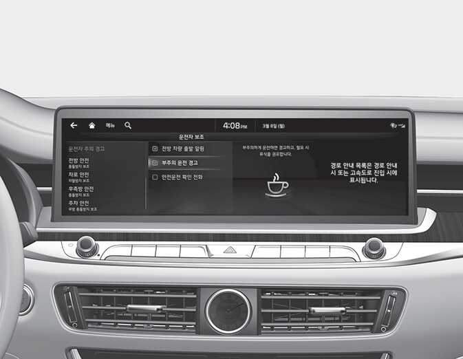 차량에서 표시할 항목이나 안내할 항목을 설정할 수 있습니다. 인포테인먼트 시스템 화면 내에 “설정 →차량” 메뉴를 선택한 후에 해당 항목들을 설정하십시오.