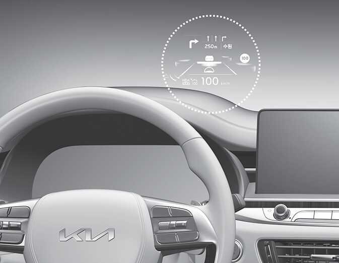 운전자 전면 유리창에 계기판 및 내비게이션의 주요정보를 표시하여 운전자의 시선을 분산시키지 않고 정보를 제공하는 편의장치입니다.