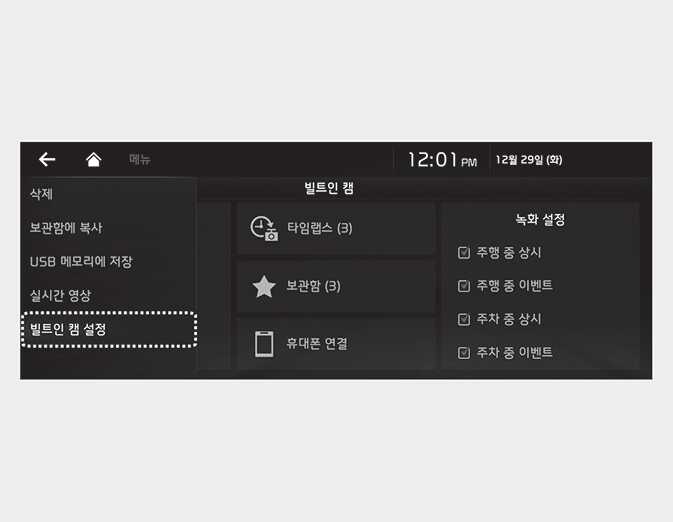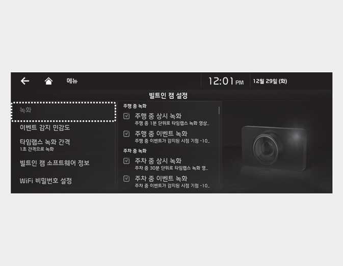인포테인먼트 시스템 홈 화면에서 빌트인 캠을 선택한 후, '빌트인 캠 설정 → ‘녹화’를 차례로 선택하십시오. 주행 및 주차 시 녹화 방법을 선택할 수 있습니다.