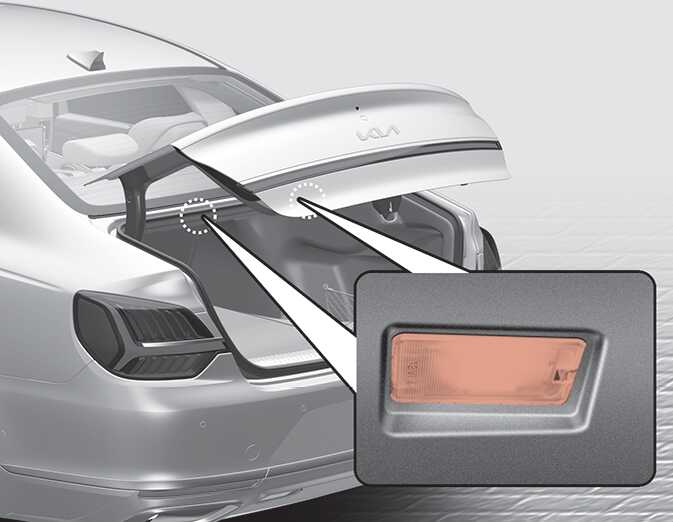 트렁크를 닫을 경우는 확실히 닫으십시오 . 만일 시동이 걸리지 않은 상태에서 계속 열려 있을 경우, 램프가 계속 켜짐되어 배터리의 방전을 일으킬 수도 있습니다.