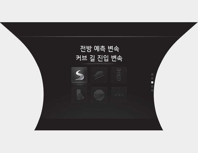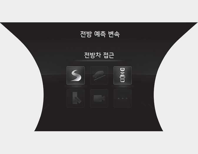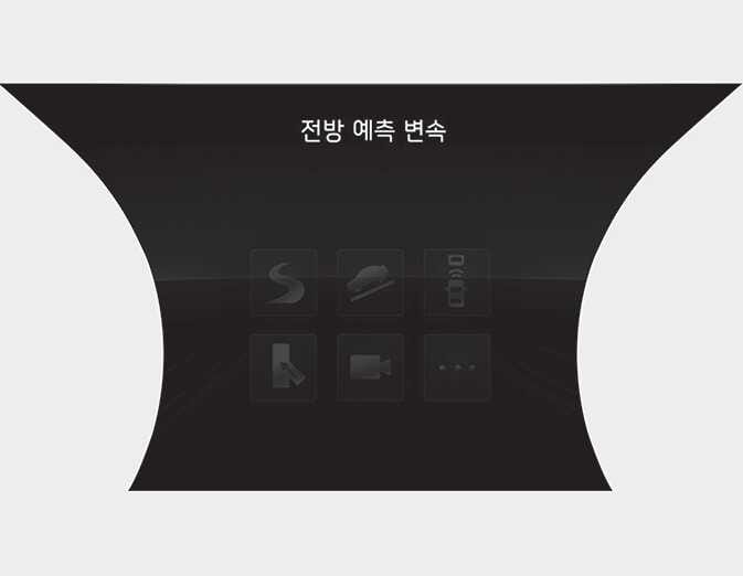 전방 예측 변속의 작동을 위해 전방의 상황이 감지된 경우, 클러스터 중앙부에는 감지된 상황의 아이콘이 총 6개 켜집니다.