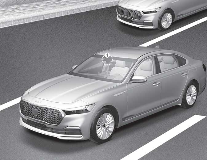 전방 카메라는 전방의 노면 형상을 감지하는 센서입니다. 앞 유리창 또는 센서에 눈, 비 또는 이물질이 묻으면 센서의 감지 성능이 저하되어 카메라 정보 이용이 제한됩니다. 항상 깨끗하게 유지하십시오.