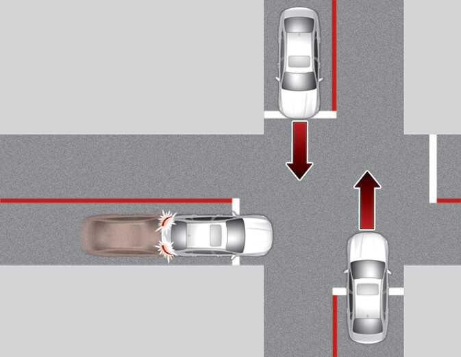 교차로 직진 시 좌우 방향에서 접근하는 차량과의 충돌 위험이 판단되면 충돌하지 않도록 제동을 도와줍니다.