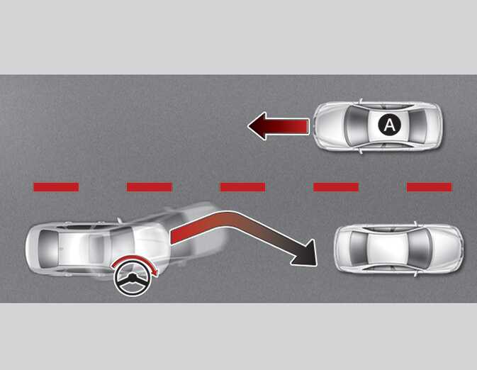 차로변경 시 맞은편에서 접근하는 차량과의 충돌 위험이 판단되면 충돌하지 않도록 조향을 도와줍니다.