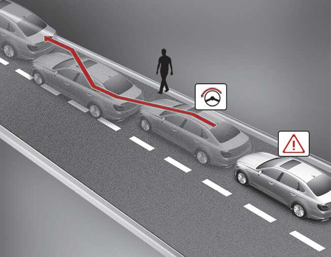 차로 내 전방의 차량, 보행자 및 자전거 탑승자와의 충돌 위험이 판단되어 경고가 발생할 경우 운전자가 충돌을 피하기 위해 스티어링 휠을 조작하면 조향을 도와줍니다.