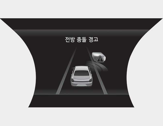 전방 충돌 경고 ORJ0411801 ORJ041185 경고문, 경고음, 스티어링 휠 진동을 통해 전방 충돌 경고를 알립니다. 전방 충돌 경고는 다음의 조건에서 작동합니다. 자차 속도: 약 40~145 km/h