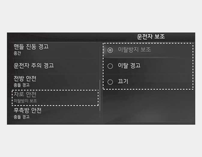 시동 ‘ON’ 상태에서 인포테인먼트 시스템의 설정 → 차량 → 운전자 보조 → 차로 안전을 차례로 선택하십시오. 각 기능의 사용 여부를 선택하실 수 있습니다.