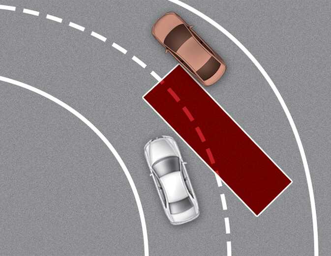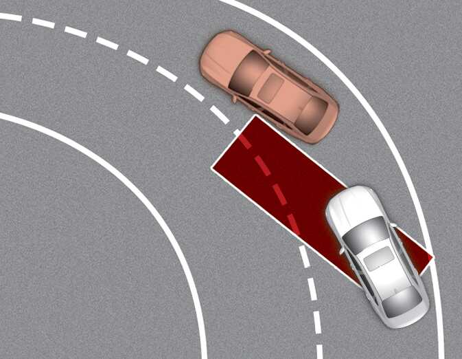 커브 길에서는 옆 차로에 있는 차량을 인식하지 못해 후측방 충돌방지 보조가 정상적으로 작동하지 않을 수 있습니다.