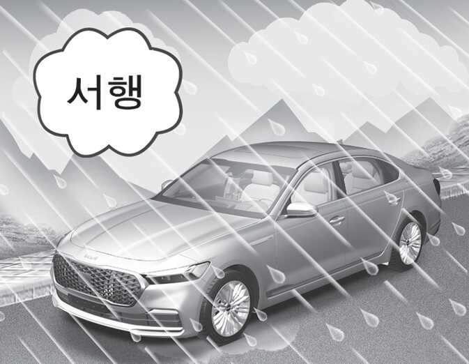 폭우가 내릴 때는 시야를 확보하기가 더 어려워 제동 거리가 더 많이 필요하므로 천천히 운행하십시오.