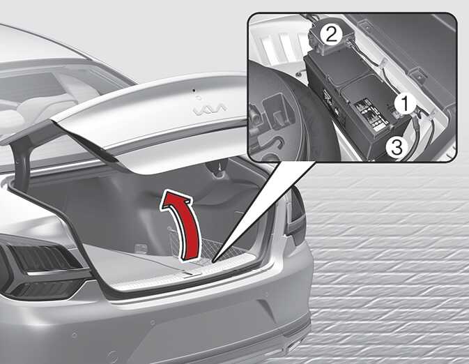 교체시 배터리 「-」 케이블(①)을 먼저 분리하고, 「+」측의 배터리 퓨즈 박스(②)를 분리하십시오. 배터리 고정 브라켓(3)을 분리하십시오.
