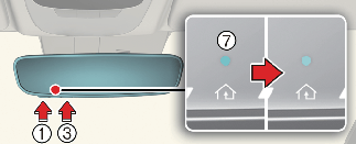 If the indicator (4) or (6) does not turn to green, it indicates that the last status of garage door was not received properly. The HomeLink mirror tries to receive the last known status of the garage door for a few seconds.