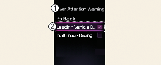 With the vehicle on, select User Settings→ Driver Assistance → Driver Attention Warning from the settings menu in the instrument cluster or select Setup→ Vehicle → Driver Assistance → Driver Attention Warning from the infotainment system to set whether or not to use each function.