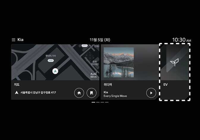 인포테인먼트(오디오, 비디오, 내비게이션) 홈 화면에서 EV 메뉴를 선택하면 EV 모드로 진입합니다. |