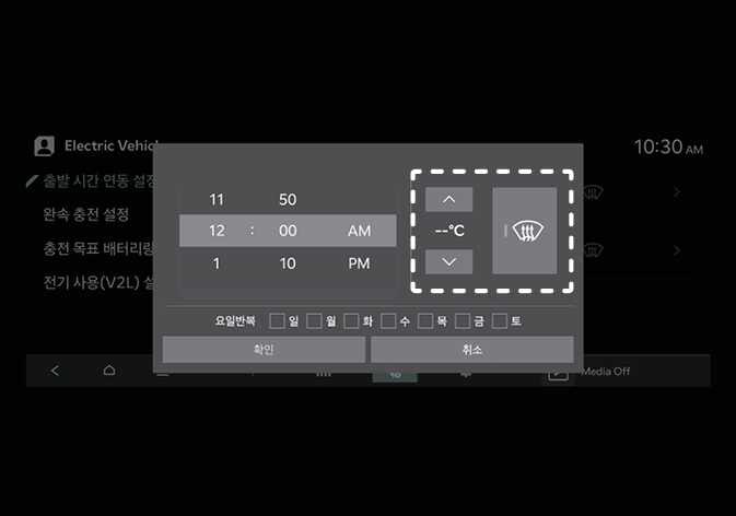• 겨울철 충전 케이블이 연결된 상태에서 예약 공조를 통해 희망 온도를 설정하면 구동용(고전압) 배터리 충전량 손실 없이 실내 난방이 가능하며, 구동용(고전압) 배터리 내부 온도를 올려 전기차 성능을 높이는 데에 도움을 줄 수 있습니다.
