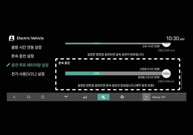 급속 충전이나 완속 충전할 때 배터리 목표 충전량을 설정하여 운전자가 원하는 최종 충전량을 선택할 수 있습니다.