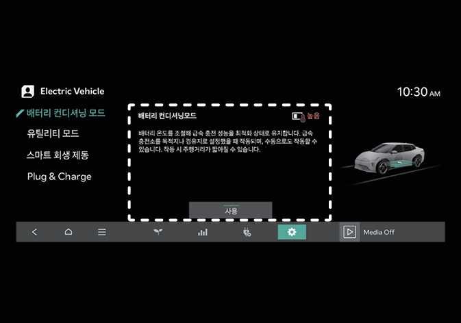 배터리 컨디셔닝 모드는 더운 여름이나 추운 겨울과 같이 고전압 배터리의 온도가 높거나 낮을 때 충전 성능을 상온 수준으로 유지하게 도와주는 기능입니다.