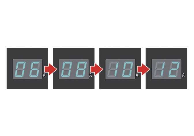 버튼(1)을 누를 때마다 제어 박스에 표시되는 전류가 6 A, 8 A, 10 A, 12 A 순서로 변경됩니다.
