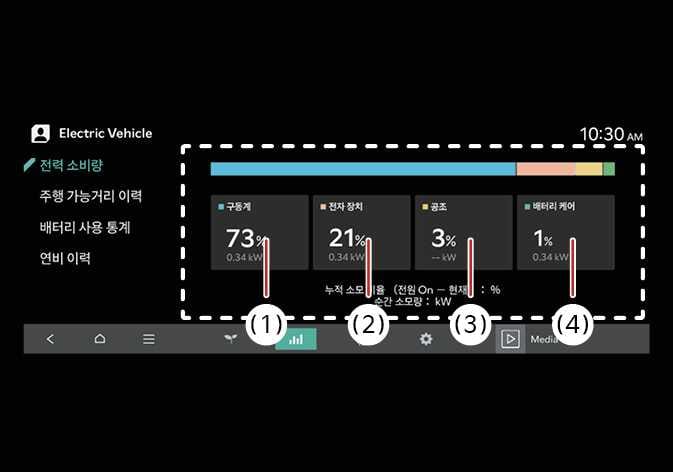 클러스터, 인포테인먼트 시스템(스피커, 내비게이션), 헤드램프, 차량 제어기 등의 차량 시스템이 사용하는 파워 및 에너지 소모 비율을 표시합니다.