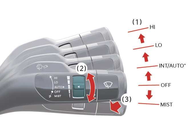 와이퍼 조절 N_CT25C073 와이퍼 속도 조절 HI: 고속 작동 LO: 저속 작동 INT/ AUTO*: 간헐적 작동/자동 조절* OFF: 작동 정지 MIST: 와이퍼 1회 작동 와이퍼 간헐적 작동/자동 조절 속도 기준 변경 앞유리 워셔액 분출 및 와이퍼 일시 작동 사양 적용 시